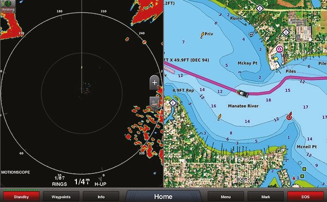 Sobreponha o radar na tela da carta náutica, em tela única ou tela dividida, com configurações de alcance independentes.
