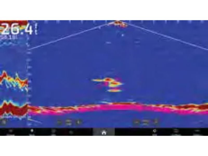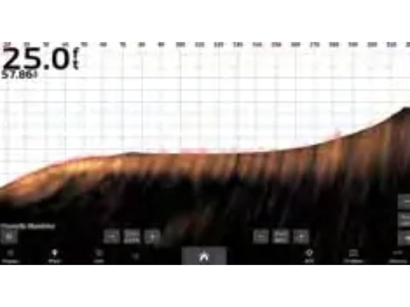 Mostra imagens do sonar em tempo real de pequenos e grandes peixes ou iscas, nadando abaixo do seu barco e identifica sua distância à esquerda ou à direita, juntamente de suas profundidades.