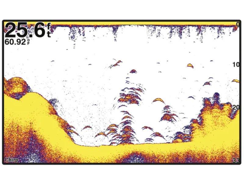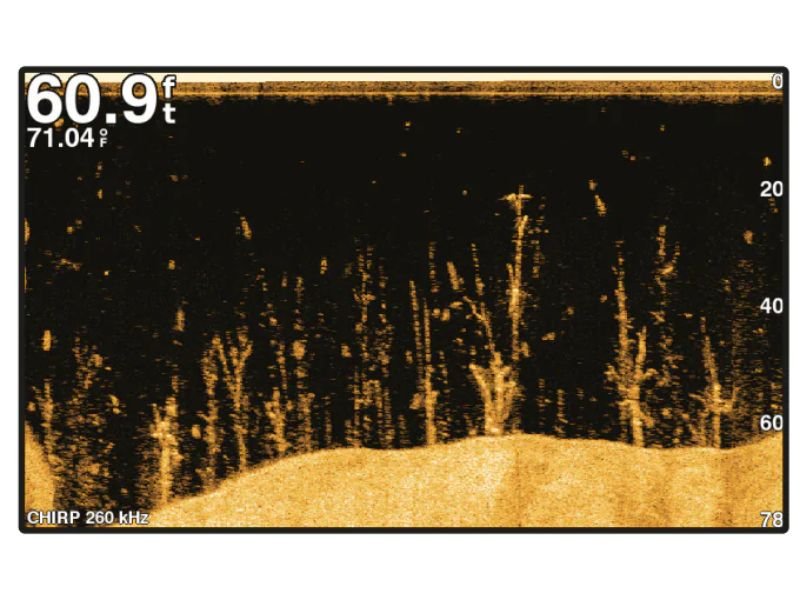 O sonar CHIRP tradicional da Garmin envia uma varredura contínua de frequências que variam de baixo a alto. Essa varredura de frequências fornece uma ampla gama de dados para criar uma imagem incrivelmente clara e de alta resolução.