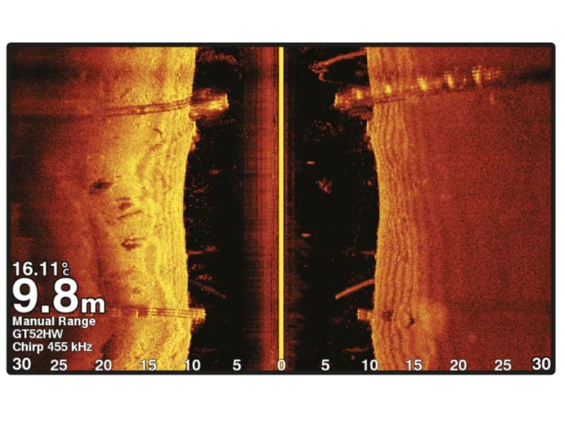 O SideVü fornece uma imagem altamente detalhada e de alta resolução da estrutura e dos peixes de cada lado do seu barco. É excelente para explorar, encontrar peixes e os tipos certos de estruturas para uma pescaria bem-sucedida.