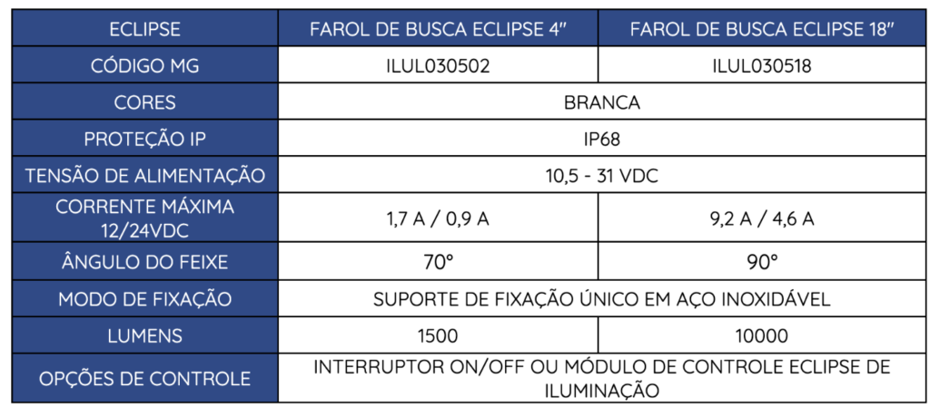 Os faróis de busca ECLIPSE geram uma poderosa luz branca nítida para iluminar os lugares mais difíceis de ver a bordo.