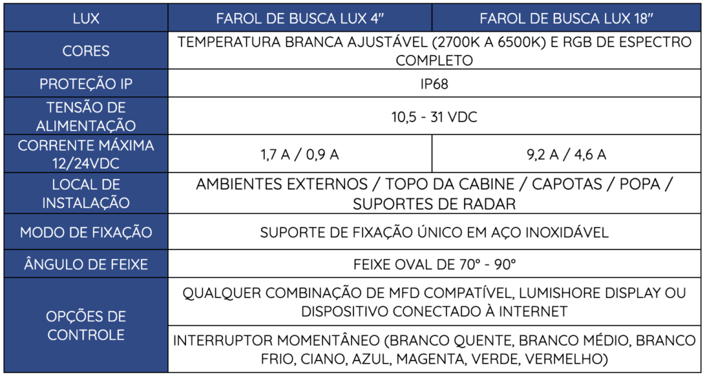 Os novos faróis de busca articulados compactos da série LUX são ideais para montagem em ambientes externos, topo da cabine, capotas, popa e nos suportes de radar. Dimerizável de fábrica.