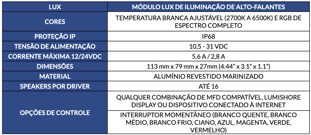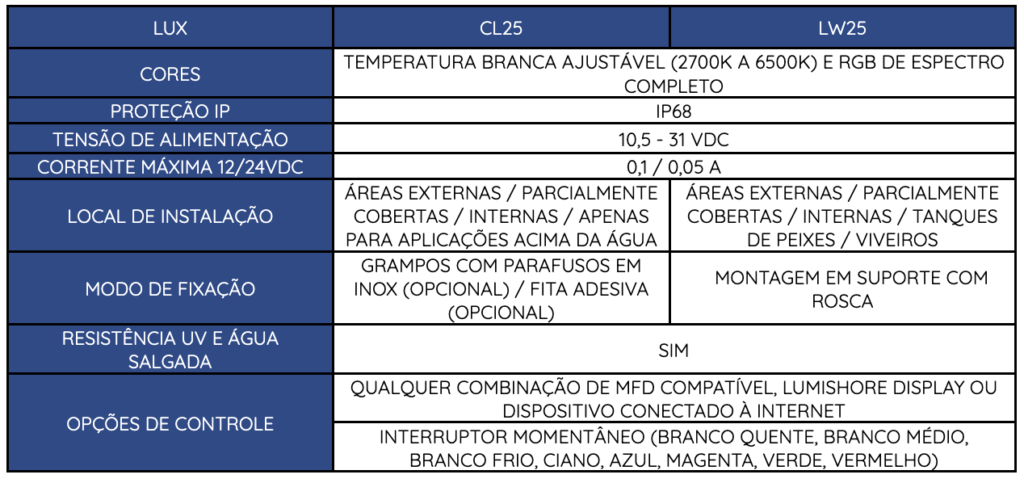 Adequadas para instalação interior e exterior, as luzes de cortesia LUX não só irão melhorar qualquer espaço, como irão adicionar visibilidade e segurança a bordo. Dimerizável de fábrica.