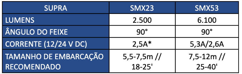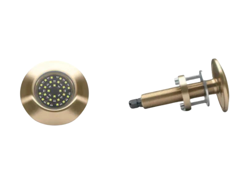 Corpo em bronze marinizado e com lente de vidro borossilicato BK7, para suportar o ambiente marítimo. Montagem na popa e lateral de embarcações.